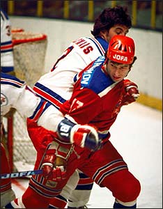 Many will best remember Valeri Kharlamov for his role in the 1972 Summit Series versus Team Canada. So effective was the high-flying winger that in Game Six, Canada's Bobby Clarke took an aggressive chop at his ankle. Although he finished the game, Kharlamov's ankle was cracked. He missed Game Seven and was clearly playing injured in the pivotal final game. Still, Valeri scored three goals and four assists in the seven games he played. Kharlamov also played in the 1974 Pro Classic against the WHA stars, scoring two goals and six assists in the eight-game tournament. In 40 games played against North American professionals, Kharlamov collected 19 goals and 29 assists for 48 points.