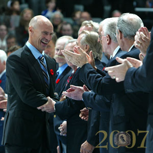 Mark Messier is welcomed by a row of Honoured Members at the 8th annual Hockey Hall of Fame Game featuring Toronto Maple Leafs and the New York Rangers. (Dave Sandford/HHOF/10Nov07)